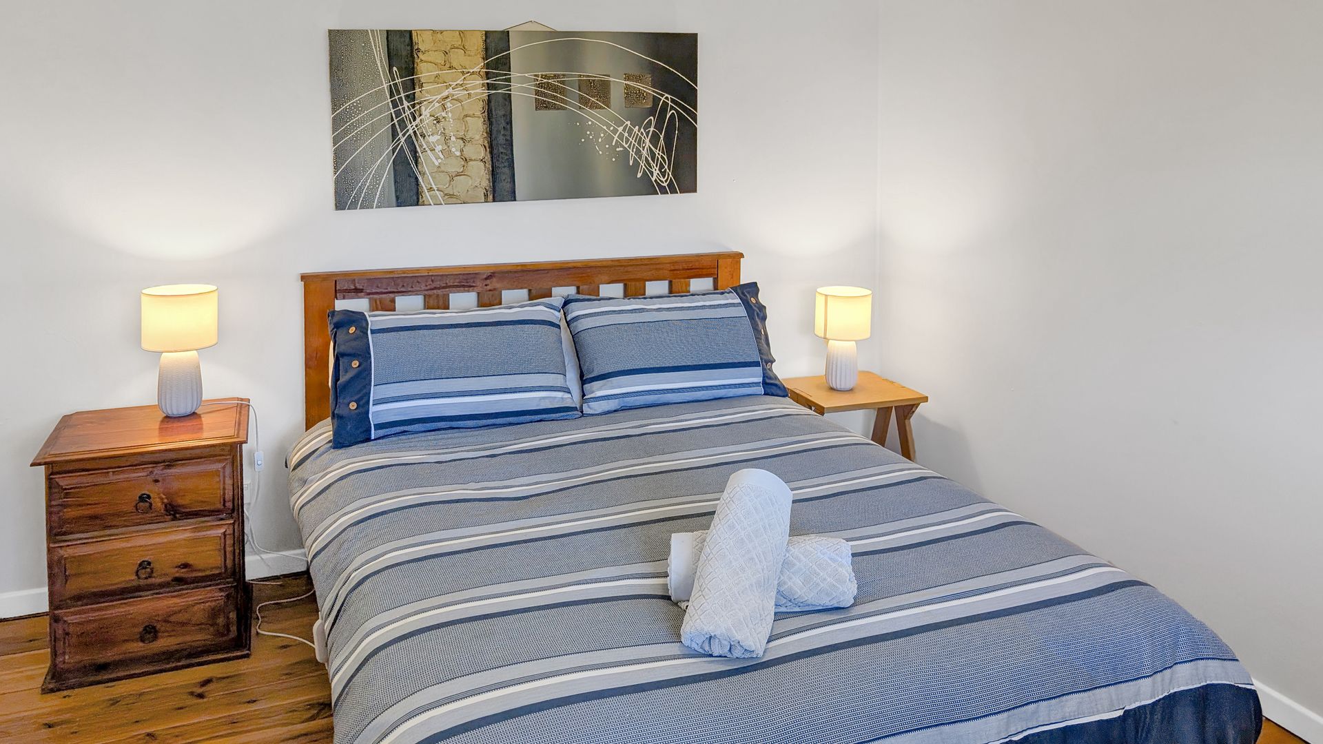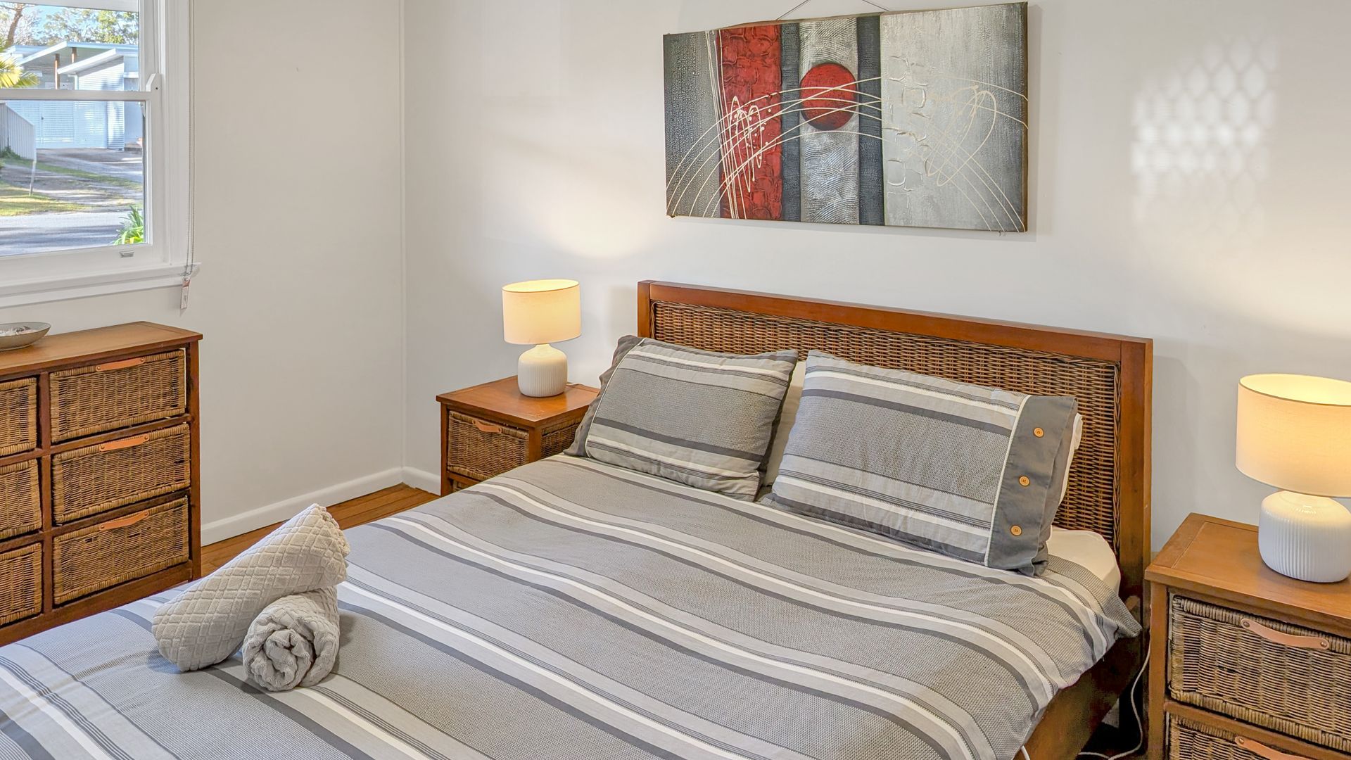 - Bed 1: Queen bed with chest of drawers and a ceiling fan