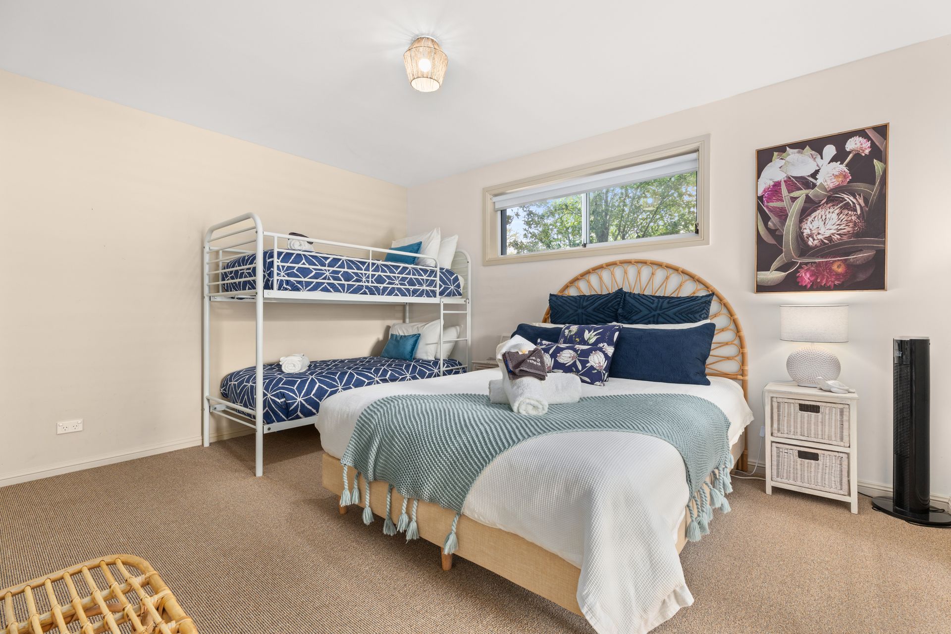 - Bed 3: Queen bed + bunk bed with ceiling fan, portable heater and built-in wardrobe